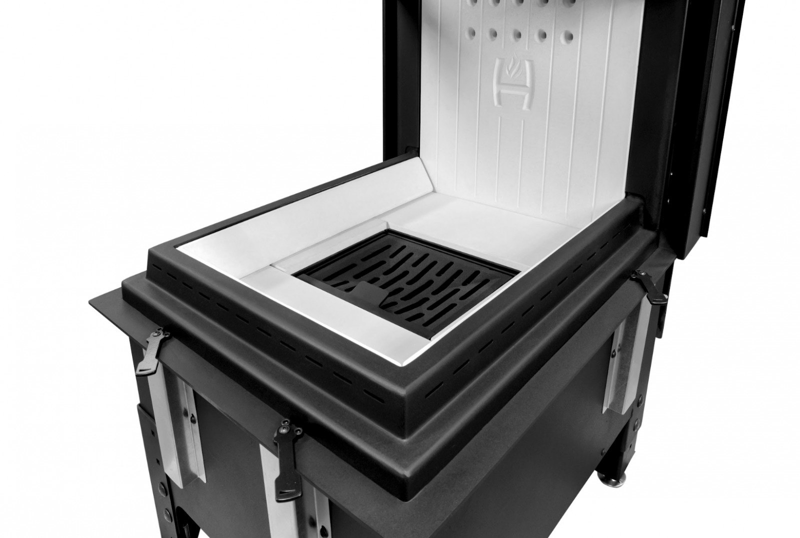 - Zlepšené parametry a účinnost spalování díky obložení spalovací komory žáruvzdornými keramickými panely z keramického betonu, akumulující teplo ve spalovací komoře. Otvory v zadní stěně topeniště jsou nezávisle ventilovaným systémem spalování spalin.
