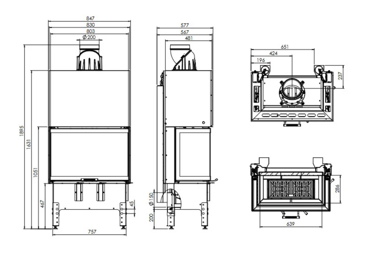 - Venkovní vzduch je přiváděn přes konektor Ø150 a je pak rozdělen do tří nezávislých kanálů Ø90: pod roštem, spodní vzduchová clona, dohořívání spalin a horní vzduchová clona.